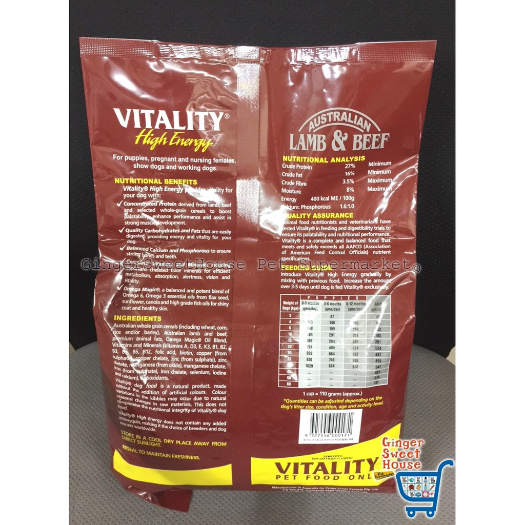 Your dog deserves vitality high energy dog food the complete and balanced nutrition prepared from the concentrated protein of high quality australian lamb and beef combined with selected premium quality wholegrain cereals as its primary ingredients.